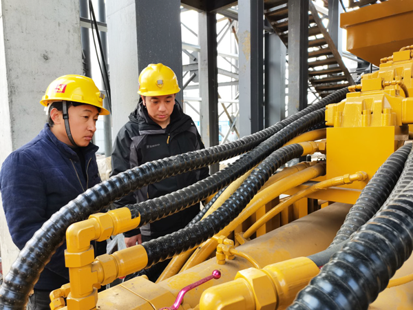 谢桥矿工作人员正在检查环保充填开采工程相关设备运转情况