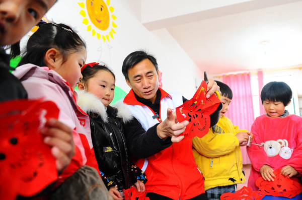 杨同林在潘集区李圩幼儿园教小朋友们剪纸。