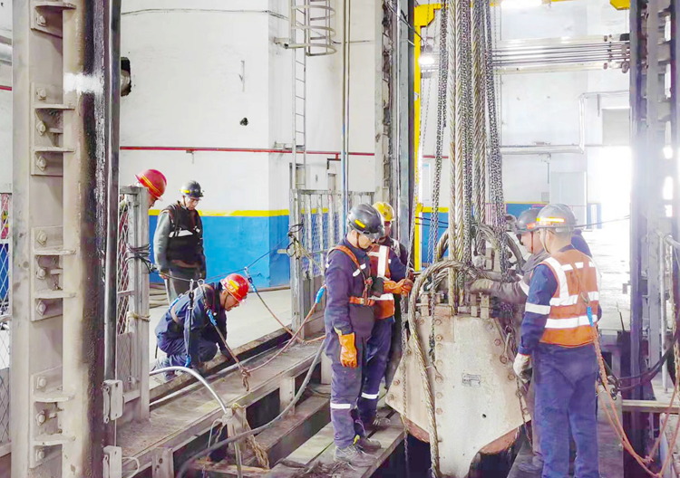 近日,西部矿建安装分公司用时19个小时,圆满完成色连二矿副井宽窄罐6根首绳自主更换的任务,确保色连二矿副井宽窄罐安全高效运行。图为该分公司职工正在色连二矿副井施工。(燕科羽 摄)