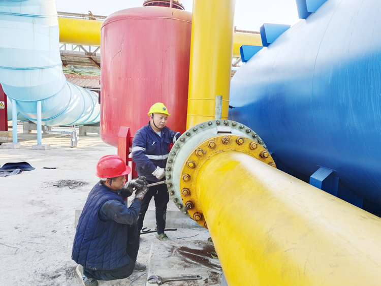 为做好冬季低温天气矿井供暖工作,煤业公司谢桥矿认真对低浓瓦斯氧化系统进行检修维护,确保冬季矿井供暖可靠稳定。图为该矿保供工区职工正在检修瓦斯氧化系统的干式阻火器。(胡涛涛 摄)