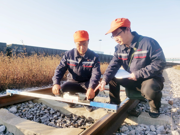 为确保冬季煤炭运输畅通,淮河能源股份铁运分公司加大对线路的巡查力度,消除线路安全隐患,保障行车安全。图为该公司工务段线路工正在对铁路线路静态几何尺寸及结构病害进行检查。(左琦 摄)