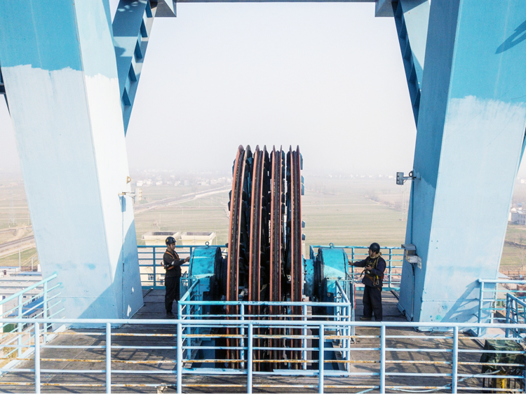 为进一步提高设备的安全可靠性,煤业公司顾桥矿在元旦期间开展提升系统专项检查活动,确保矿井节日期间安全生产。图为该矿东区机电工区职工在对副井天轮进行巡查。(刘喜 摄)