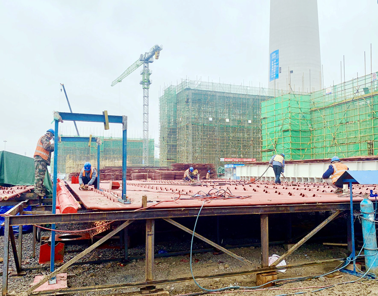 冬季气温较低,电力集团潘集电厂项目部吸取丰城电厂冷却塔施工平台坍塌等行业事故教训,克服低温阴雨天气影响,有序组织施工,合理安排工序,对安全、质量、进度进行严格监督管理,确保各项工程节点目标顺利实现。图为施工人员正在进行2号锅炉后竖井包墙地面组合的准备工作。(魏嘉佚 摄)