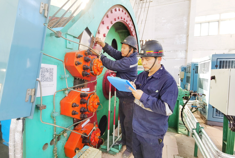 为确保寒冬季节提升系统正常运转,煤业公司张集矿认真落实集团公司安全一号文要求,强抓提升系统检修质量,源头杜绝事故隐患,新安装14台暖风机为井筒供暖,确保提升系统安全高效运行。图为该矿绞车一队检修工正在测量绞车盘式制动闸与制动盘间隙。(徐璐璐 摄)