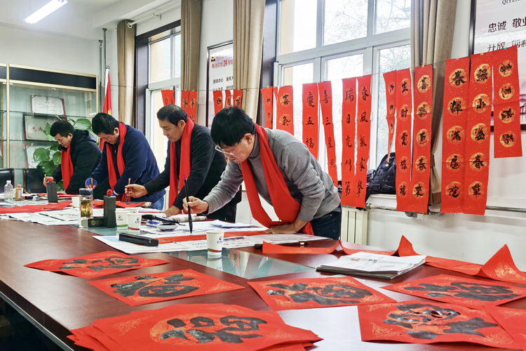新春佳节临近,为营造浓厚节日氛围,推进家文化建设,集团公司机关工会组织开展“写春联·送祝福”活动,邀请矿区知名书法爱好者书写春联,将新春的祝福送到职工们的心中。 图为书法爱好者在书写春联。(潘冬 摄)
