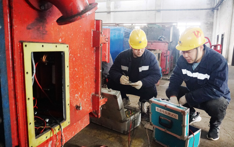 为确保矿井安全供电,淮浙煤电公司顾北矿加强供电设备管理,有计划性和针对性地做好设备入井前检查,对发现的问题及时处理,确保供电安全。图为该矿供电队职工正在对即将入井的移动变压器进行直流电阻测试。(万新 摄)