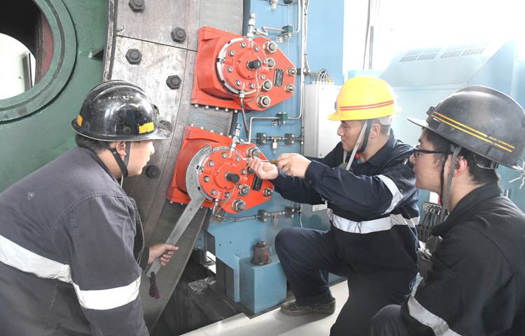 为确保矿井主提升系统正常运转,西部煤电集团泊江海子矿认真落实集团公司和西部煤电集团安全一号文相关要求,根据年初排定的检修计划,加大对盘形制动器的检查维修保养力度,为矿井安全生产保驾护航。图为该矿绞车队职工正在对盘形制动器进行检修。(王彬 摄)