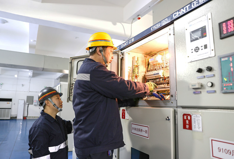 为进一步夯实矿区供电安全基础,保障矿井安全生产,近日,西部煤电集团色连二矿加大对供电系统的检修维护保养力度,及时将隐患消灭在萌芽状态,确保供电设备安全稳定运行。图为该矿保供队职工正在检修10kV高压柜。(高远 摄)