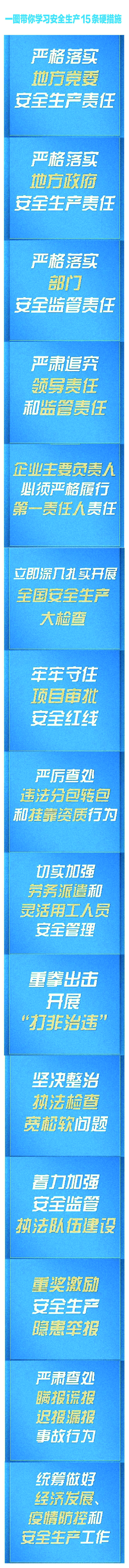近日,国务院安委会梳理相关法律法规已有规定、以往管用举措和近年来针对新情况采取的有效措施,制定了进一步强化安全生产责任落实、坚决防范遏制重特大事故的15条硬措施。为进一步强化学习宣贯,小编特梳理制作相关图解,供大家学习掌握。