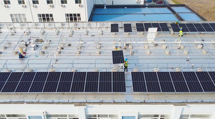 电力集团认真落实“碳达峰、碳中和”有关要求,以“清洁高效煤电+新能源”基地建设为转型升级方向,开发以自发自用为主的分布式光伏项目大力开发新能源项目,着力推动清洁能源规模化。 图为施工人员正在煤业公司宿舍楼屋顶安装分布式光伏设备。(孙飞)