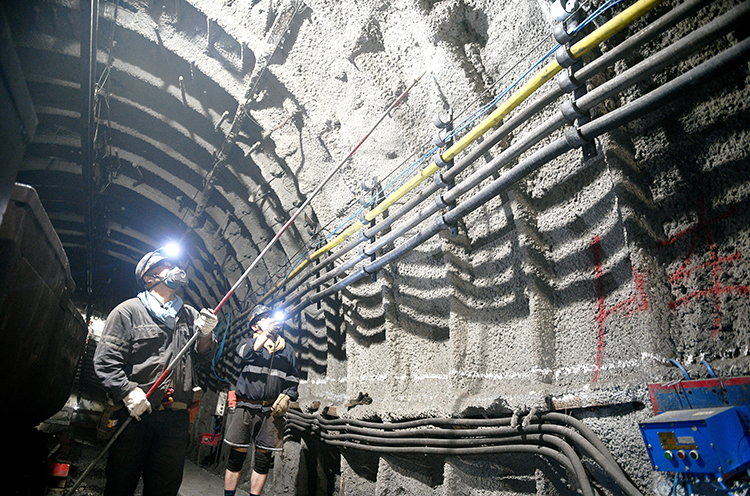 图为该矿职工正在对岩巷段进行“敲帮问顶”。(陈恩文 摄)