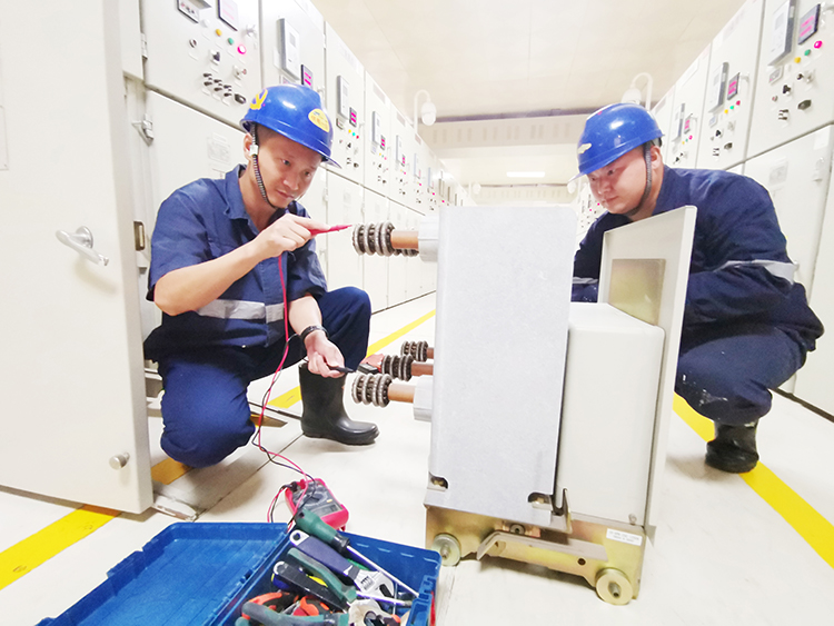 图为该矿检修人员在对110kV变电所开关柜进行检修。 (郭黎明 摄)