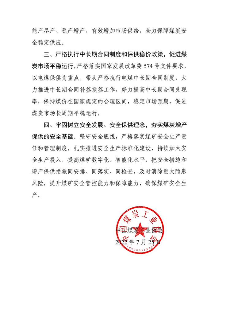 7月25日,中国煤炭工业协会发布倡议书。其中提出,严格执行中长期合同制度和保供稳价政策,促进煤炭市场平稳运行。