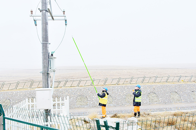 图为该公司电务人员正在泊江海子矿铁路专用线旁使用高压绝缘拉杆进行停送电作业。 (孙勇 摄)