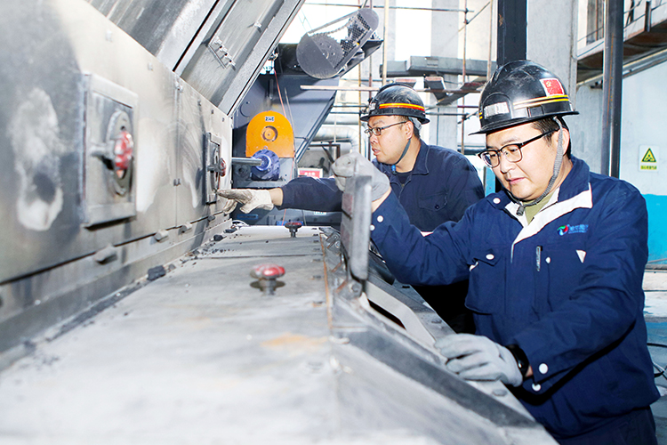 图为该矿职工检查锅炉炉排运行情况和煤层厚度。(苏旻 摄)