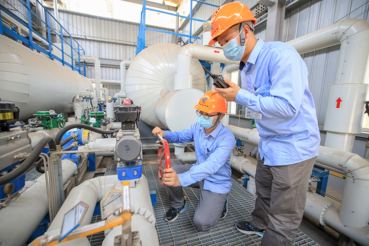图为该厂专业技术人员正在检修液氨设备。 (魏强 摄)
