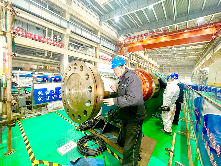 图为该厂检修人员检查#2机组发电机转子轴颈研磨状况和探伤试验结果。 (范雷 摄)