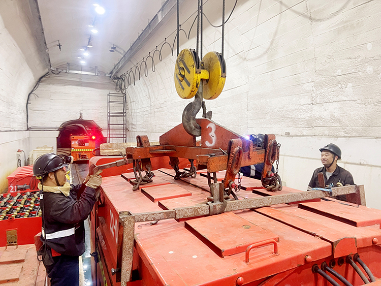 图为该矿运输一队职工正在检查充电硐室起吊设备完好情况。 (刘喜 摄)