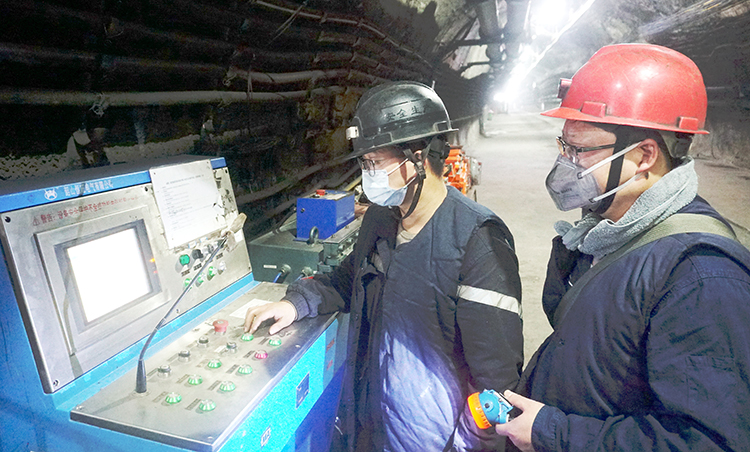 图为该矿管理人员正在查看架空人车司机现场操作情况。 (洪家杰 摄)