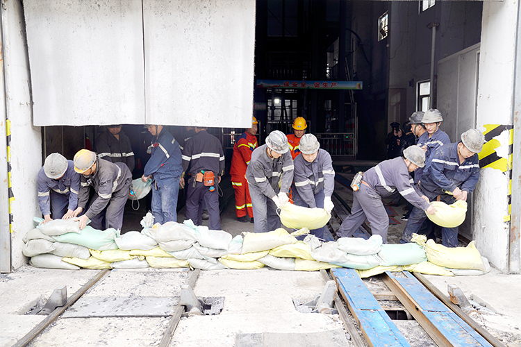 图为该矿参加演练人员正在副井上口处模拟用沙袋快速围堵雨水。 (孟珂 摄)