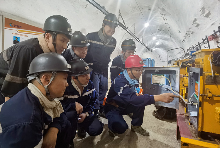 图为邵桐龄正在给青工讲解井下隔爆开关内部构造。(陈恩文 摄)