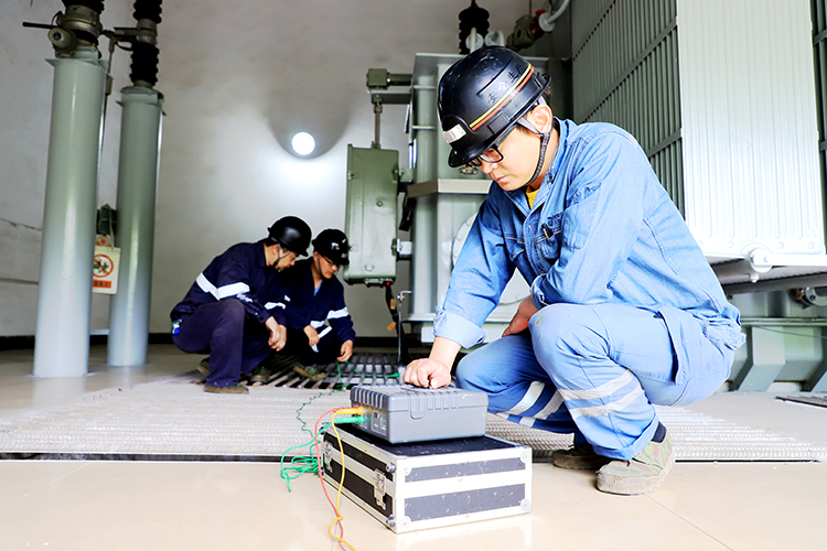 图为该矿机电二区职工对110kV变电所2#主变接地电阻进行防雷安全测试。 (刘辉 摄)
