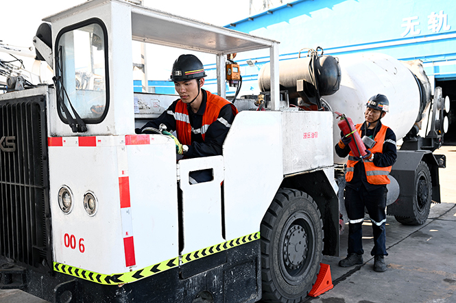 图为该矿调度所胶轮车运输队职工认真检查车辆状况。 (苏旻 摄)