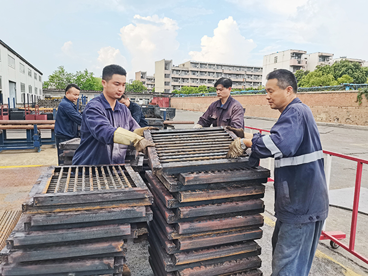 图为张集矿职工正在对后场的水沟盖板进行整理,确保定置量化符合要求。(尹欣)
