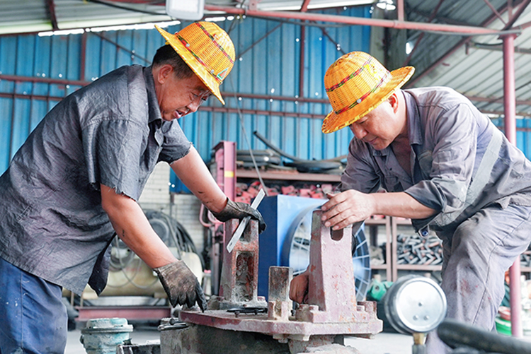 图为该矿机电修配中心职工正在维修喷浆机。(苏雨婷)