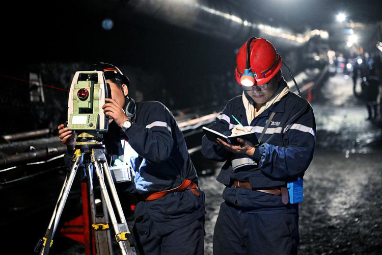 图为职工正操作全站仪开展工作面中腰线测量工作。 (苏旻 摄)
