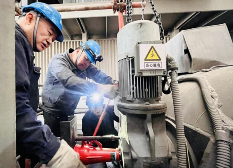 图为该厂锅炉检修人员在拆卸给煤机减速机。