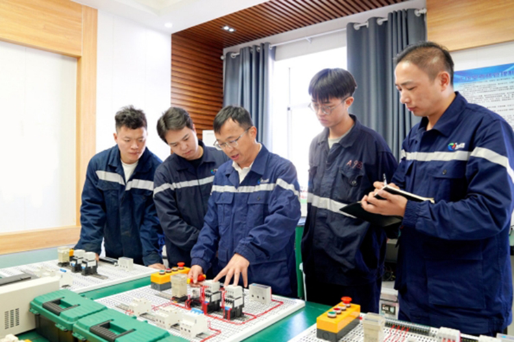 图为集团公司首席技师邵桐龄(左三)正在向学员们讲解电动机延时启动的控制原理。