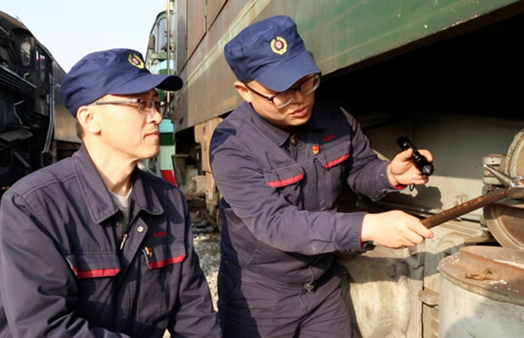 图为该公司内燃机车党员司机对机车走行部安全状态检查流程进行讲解。