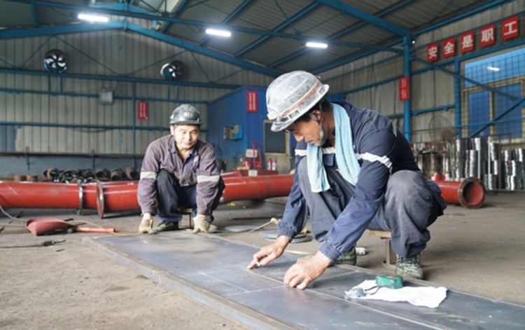 图为该矿保供工区职工加工皮带机出货点挡煤板。