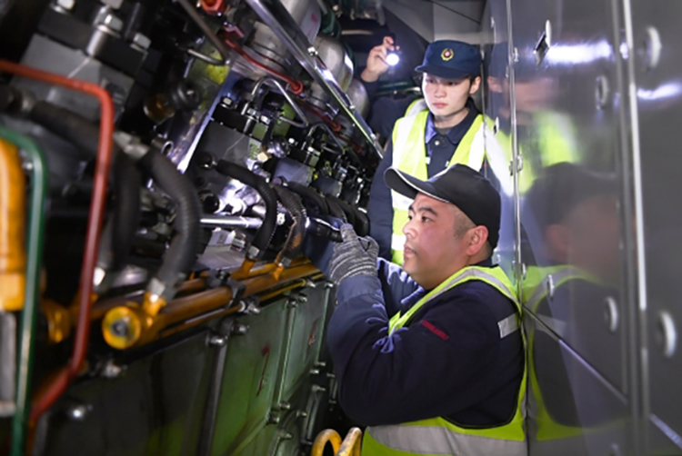 图为该公司机务段内燃机车司机检查机车部件安全状态。