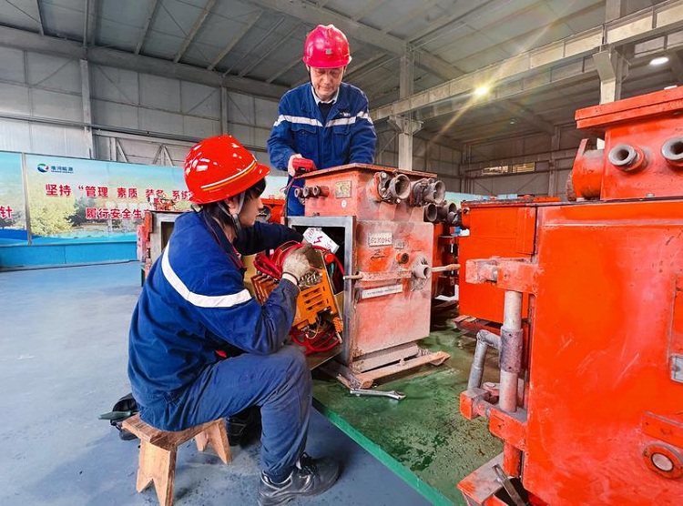 图为该矿机电修配中心职工正在维修矿用隔爆型可逆真空电磁起动器。