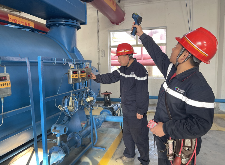 为确保瓦斯抽采系统安全稳定运行,顾桥矿认真按照集团公司相关要求,不断加大系统巡查力度,对查出的隐患,以“五定表”形式落实整改。图为该矿抽采二队职工在检查瓦斯泵站运行情况。(刘喜 摄)