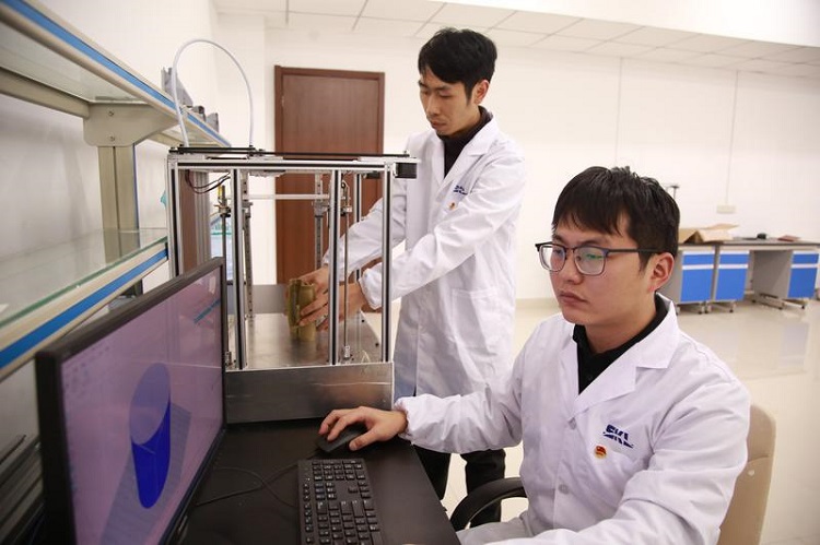 为加快矿压治理全方位创新攻关,工程院聚焦深井灾害治理,围绕“煤样、岩样动态力学性能测试,岩样三轴蠕变试验,小型地质模型3D打印”开展研究攻关,坚决打好技术创新攻坚战。图为工程院深部实验室科研人员在开展三维地质模型课题研究。 (王雪松 摄)