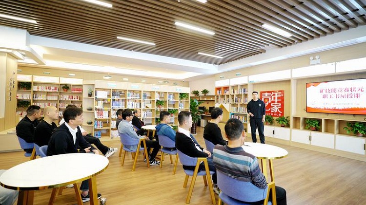 淮沪煤电公司丁集矿开展“技能竞赛状元职工书屋展风采”系列活动,通过读书沙龙的形式,邀请状元们现场示范、案例解析、问答交流,将竞赛经验转化为安全生产实效,展现新时代矿工“知识型、技能型、创新型”风采。图为丁集矿技能竞赛状元岳一鸣(右一)正在职工书屋沙龙活动中授课。(尹昕 摄)