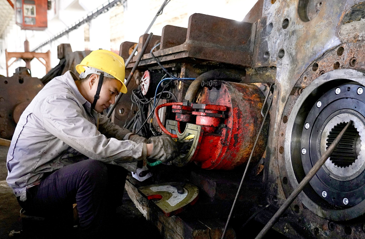 图为顾北矿机电修配中心检修人员在对采煤机牵引电机进行维修。