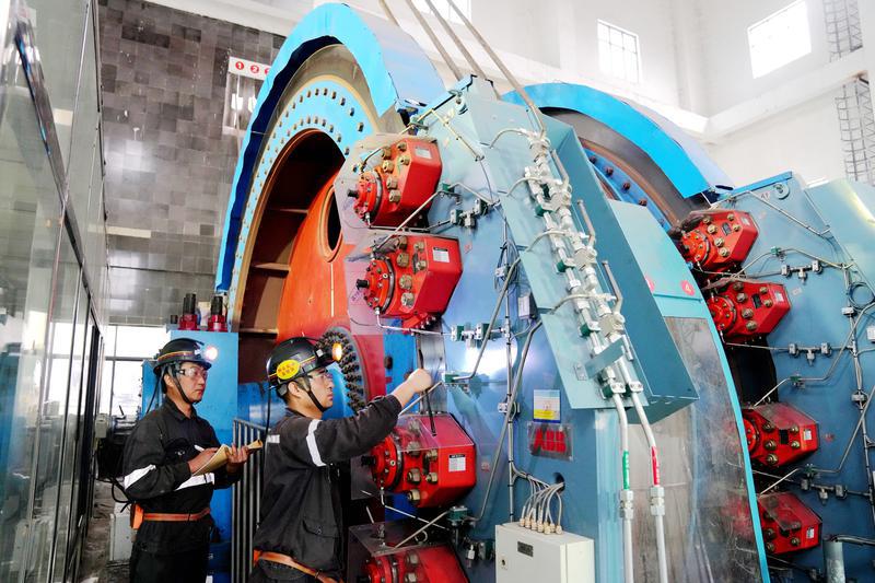 潘三矿认真落实集团公司“安全生产月”活动要求,持续强化提升系统设备隐患排查工作,扎实做好设备日常预防性检修,确保提人系统安全可靠、提煤系统高效运转。图为绞车队职工正在测量深部井罐笼制动系统闸间。 李枫 摄