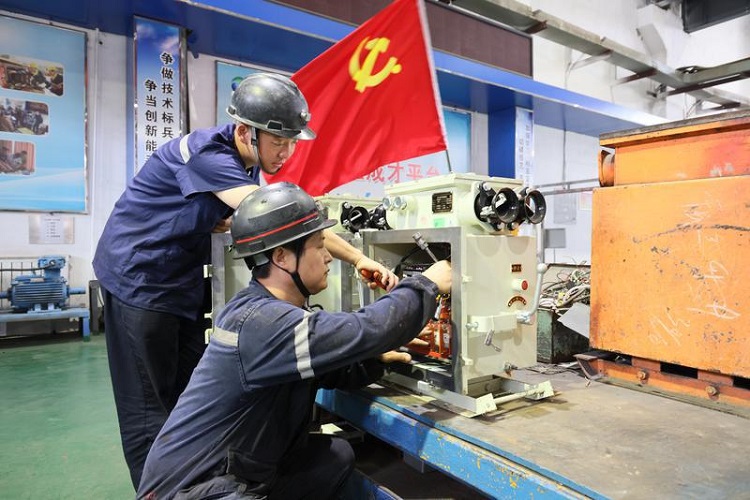 图为谢桥矿机电修配中心职工正在检修馈电开关。