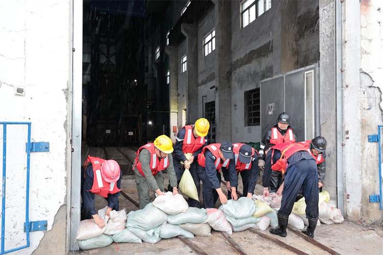 图为朱集东矿职工正在副井口搭设防洪沙袋,砌筑防洪墙。