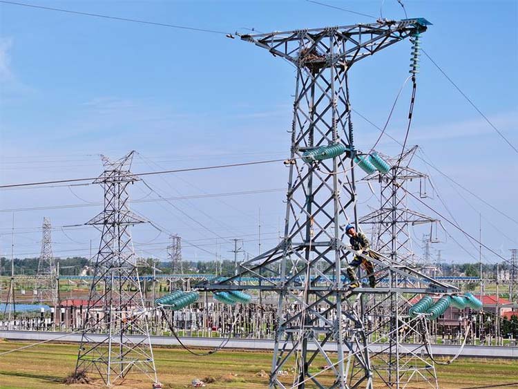 图为安装公司线路工区职工正在检修供电线路,清理杆塔上的鸟窝。