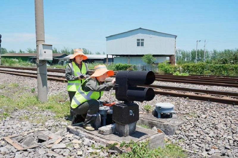 图为铁运公司职工对信号机进行安全日巡视,提升设备维护质量,确保列车安全运输。