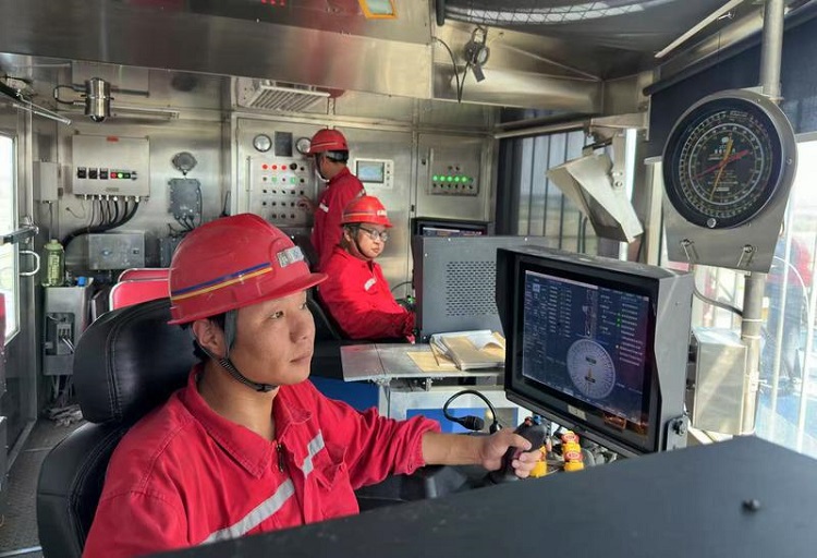 图为勘探公司地面特钻工区职工在钻机房操控钻机。