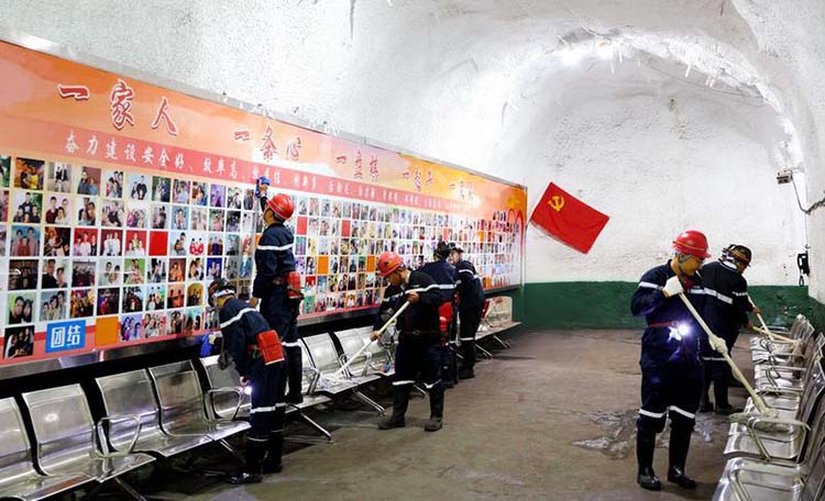 图为活动现场,党员们在整治井下等候室内的环境卫生。