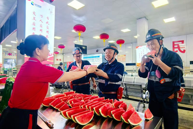 伏天已至,热浪来袭。为进一步做好防暑降温工作,潘三矿在井口开展送清凉活动,慰问奋战在一线的作业人员,切实将集团公司关爱职工举措落到实处。 图为职工下井前在井口品尝甘甜解暑的西瓜。(王雪琳 谢睿 摄)