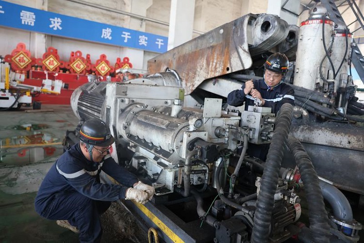 图为矿职工正在对智能化综采工作面远程供液硐室供液泵进行自主维修保养。