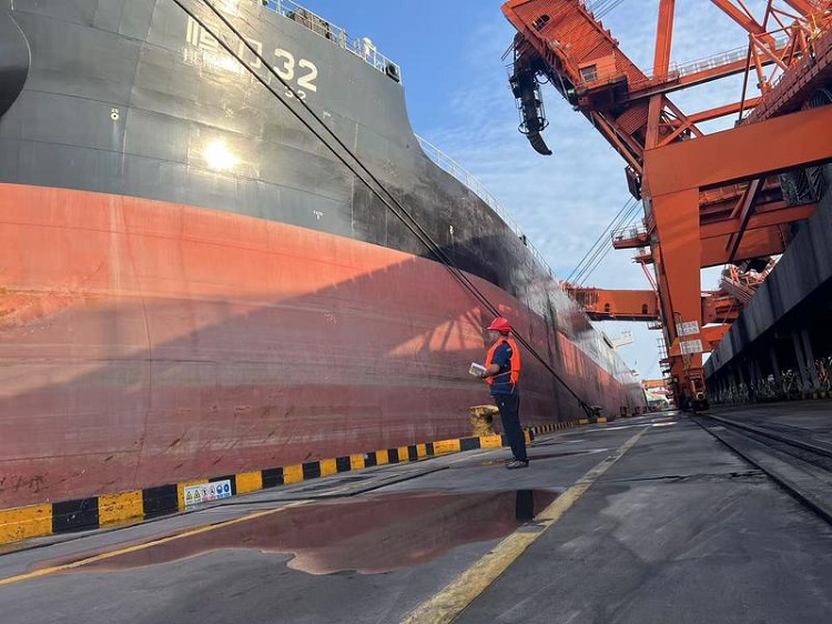 图为煤炭销售中心驻曹妃甸港口中转站职工紧盯现场、把好关键,确保煤炭高效发运。